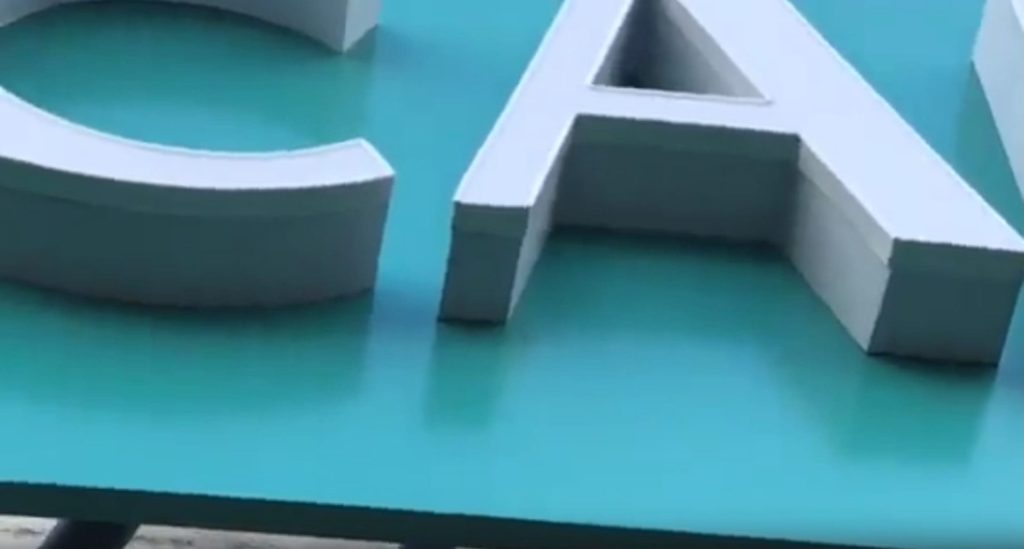Посмотрите, как сильно отличается цвет подложки основной вывески и боковой части. Дело в том, что основная часть сделана из цветного композита, а остальная — просто обклеена бирюзовой пленкой.