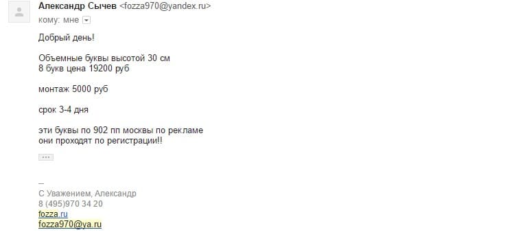 5. Дают подробную смету на бланке. А не присылают цену письмом. В смете расписаны высота букв, подготовка макетов, проводка кабеля, блок питания, доставка и подключение.