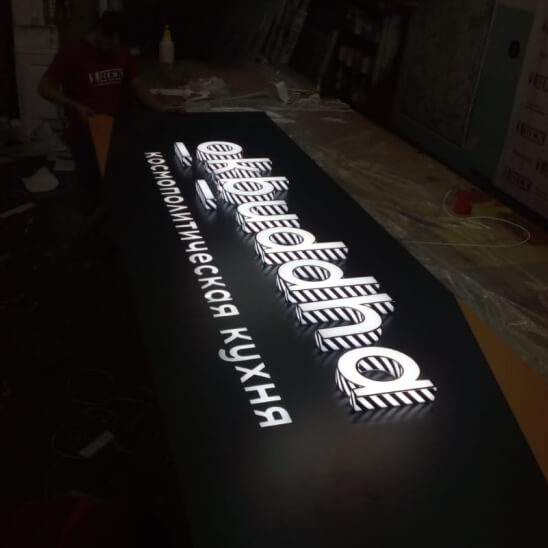 Благодаря специальному способу монтажа — на небольшом расстоянии от фона — создаётся эффект мягкого светового ореола, подчёркивающего контуры букв и придающего вывеске выразительный и стильный вид.